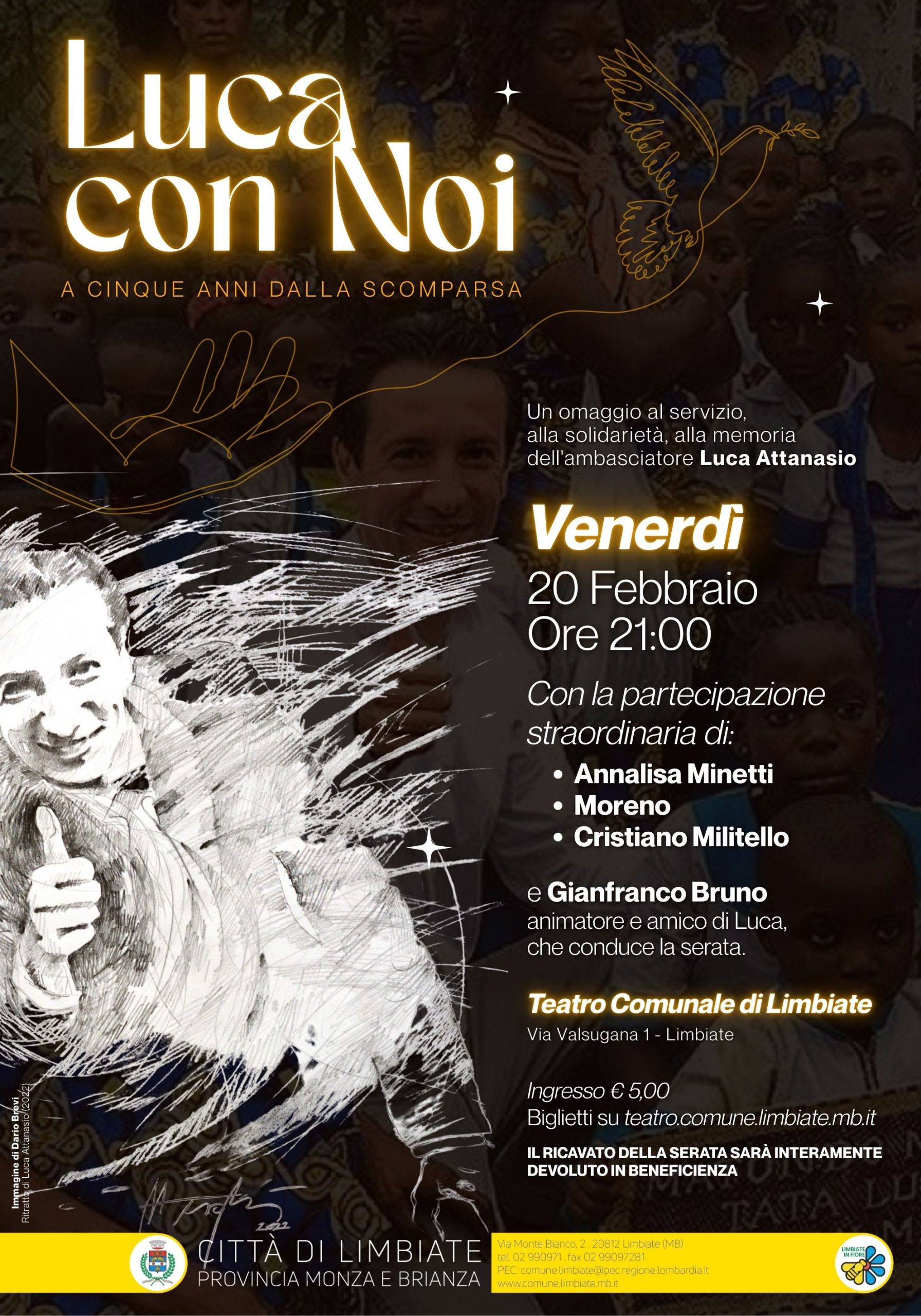 A cinque anni dalla tragica scomparsa dell’Ambasciatore Luca Attanasio, la Città di Limbiate si stringe ancora una volta attorno alla sua figura con l’evento "Luca con Noi". Venerdì 20 febbraio, alle ore 21:00, il Teatro Comunale di via Valsugana diventerà il cuore pulsante di un omaggio collettivo dedicato al servizio, alla solidarietà e alla memoria di un uomo che ha fatto del bene il suo stile di vita.